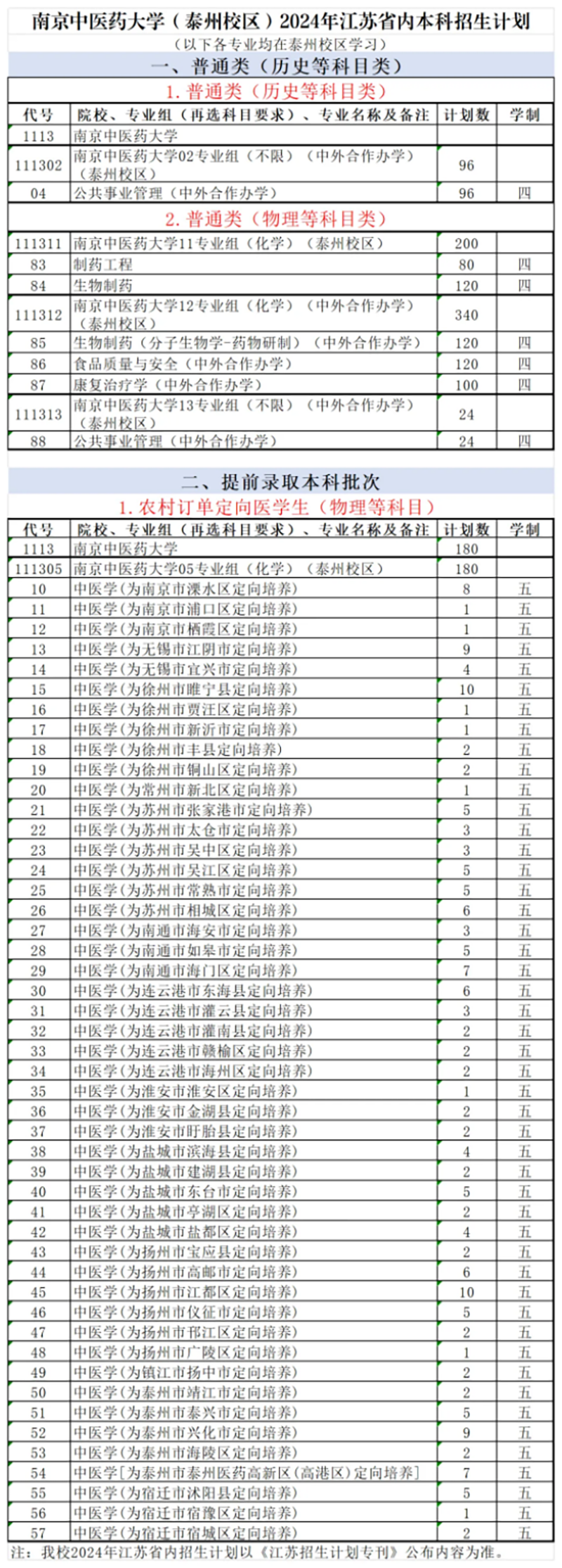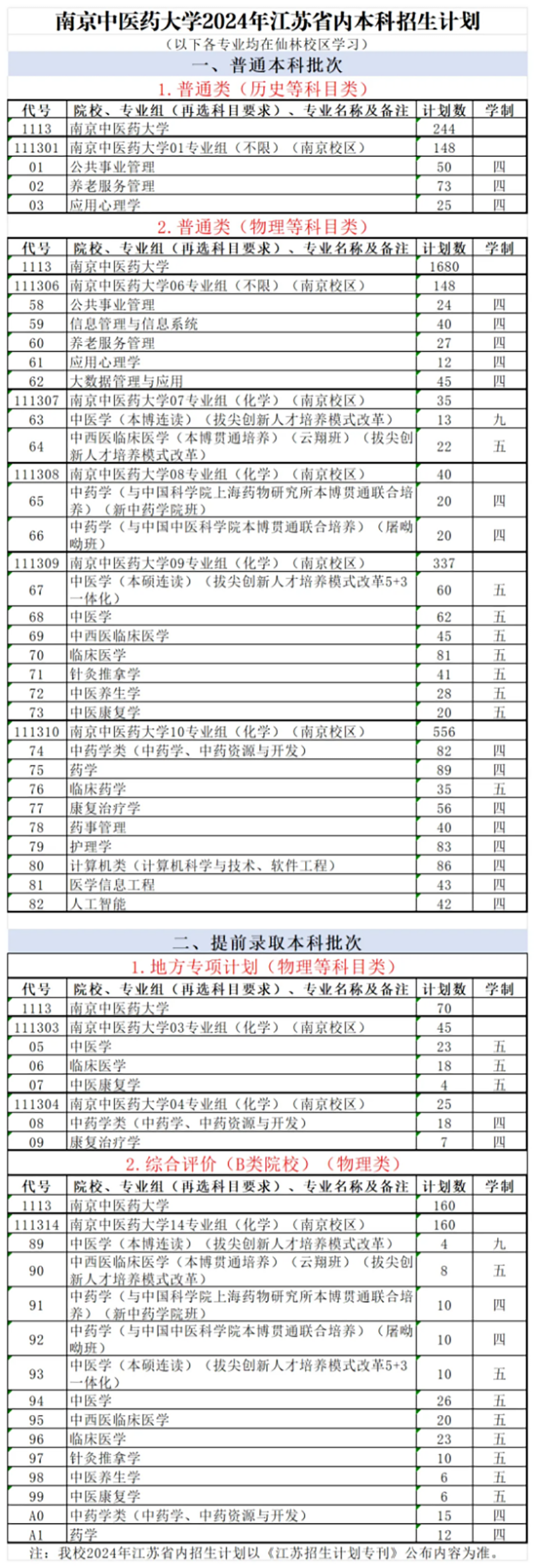 2024年 : 南京中医药大学2024年本科招生计划(江苏省)
