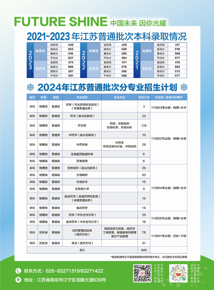 中国药科大学-2024年招生计划(河北、河南、黑龙江、湖北、湖南、吉林、江苏、江西、辽宁)