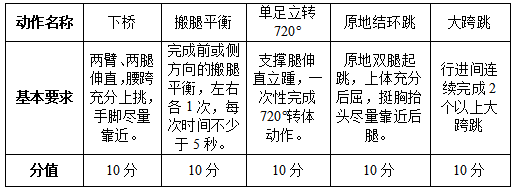 2、测试方法:考生逐一完成五个技术动作,每个动作完成一次,考评员根据考生完成动作技术规格及身体姿态进行评分。