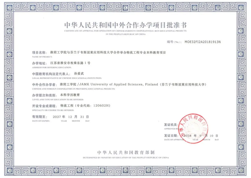 物流工程中芬合作办学项目于2018年获得国家教育部正式批准,2019年开始招生。项目采用“一站式”培养模式,立足区域经济社会发展对物流工程专业人才的需求,突出学生创新精神和创新能力的培养,着力培养具有国际视野、专业基础扎实的高素质应用型人才。本项目学生取得国外文凭和学位证书,均可获得国家教育部留学服务中心认证证书。