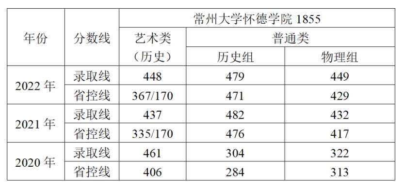 怀德学院近三年江苏省各专业招生录取控制线汇总