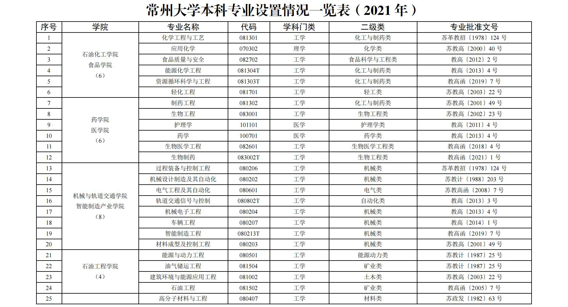 专业 : 常州大学-院系专业设置情况一览表(2021 年)