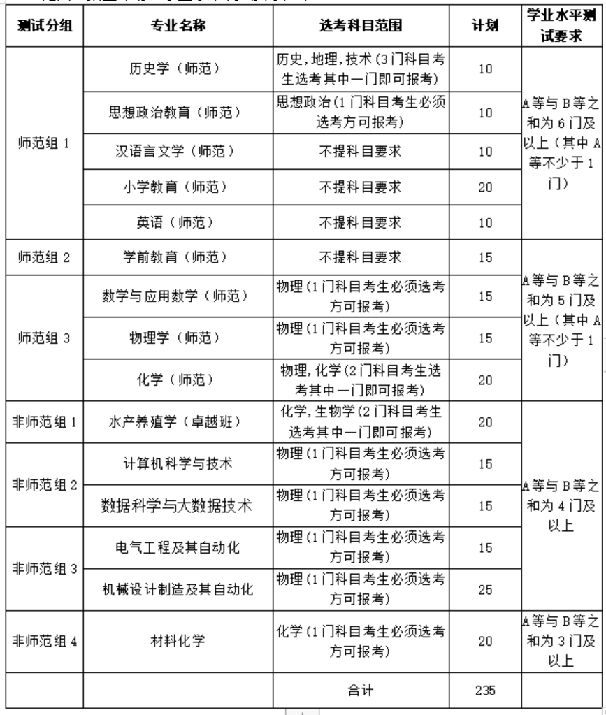 三、直接获得综合素质测试资格条件为:在符合报名条件的前提下,高中学业水平测试科目A等5门及以上,且其余为D等(新高考改革前的往届生为C等)及以上。如师范组1、师范组2、师范组3直接获得综合素质测试资格考生超过该组计划数6倍或非师范组1、非师范组2、非师范组3、非师范组4直接获得综合素质测试资格考生超过该组计划数8倍,则按各组实际直接获得综合素质测试资格人数确定。