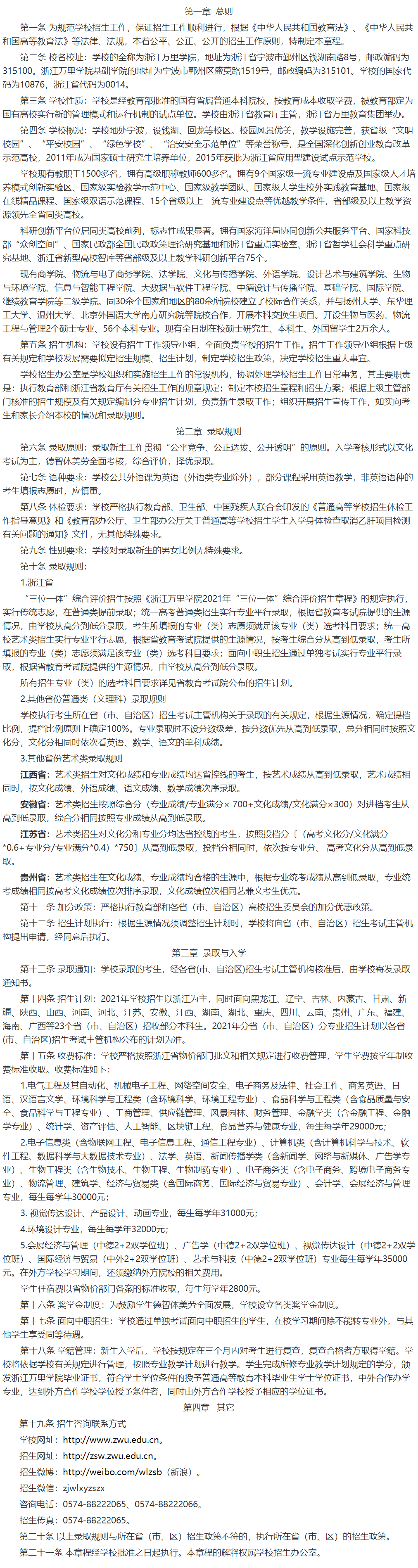 2021年 : 2021年浙江万里学院招生章程 (全日制本科)
