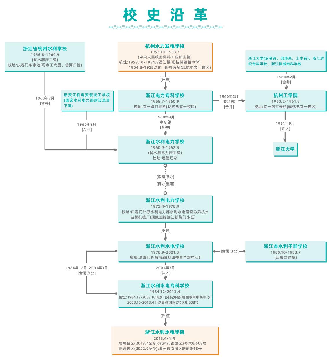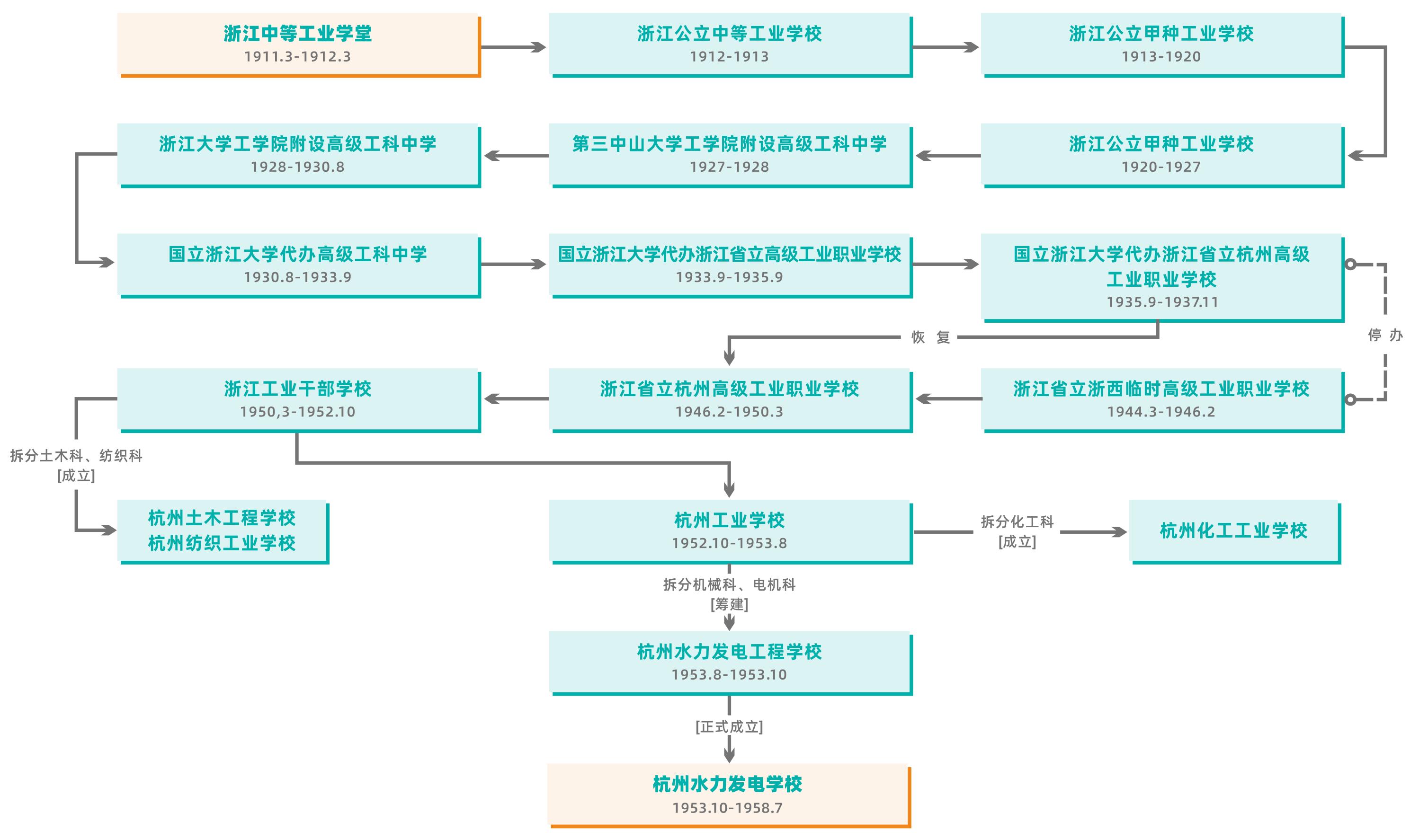 浙江水利水电学院初创阶段的重要基础是1950年3月成立的浙江工业干部学校。在中央关于“整顿和发展中等技术教育、实行专业化办学”的指示下,1952年全国院校进入大调整时期,浙江工业干部学校在拆分出纺织科、土木科后,于1952年10月转设为杭州工业学校。1953年8月,杭州工业学校相继拆分出化工科成立杭州化学工业学校;拆分出的机械科、电机科,由中央人民政府燃料工业部主管,成立了杭州水力发电学校,拉开了浙江水利水电学院的发展大幕。