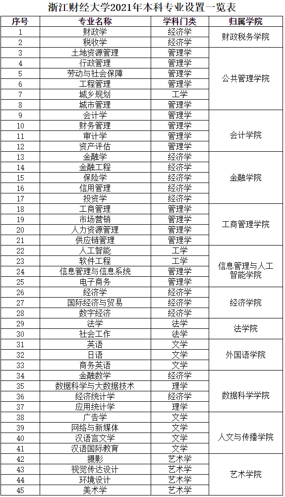 专业 : 浙江财经大学2021年本科专业设置一览表