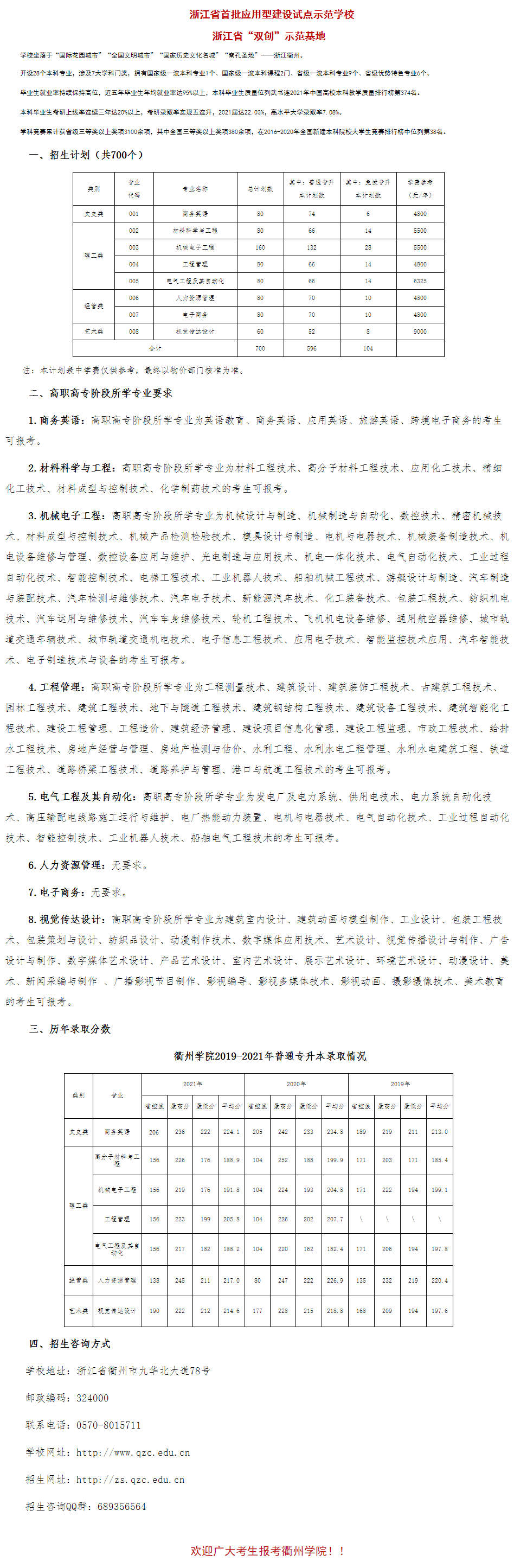 2022年 : 衢州学院2022年专升本招生计划