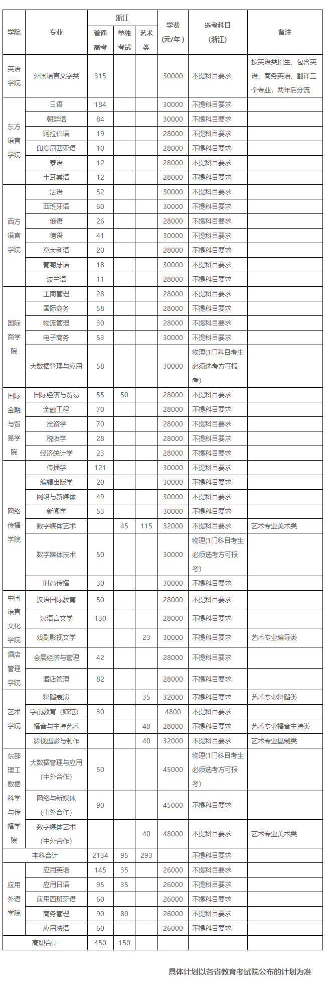 2021年 : 浙江越秀外国语学院2021年招生计划(省外)