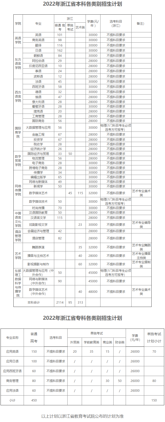 2022年 : 浙江越秀外国语学院2022年本专科招生计划(浙江省)