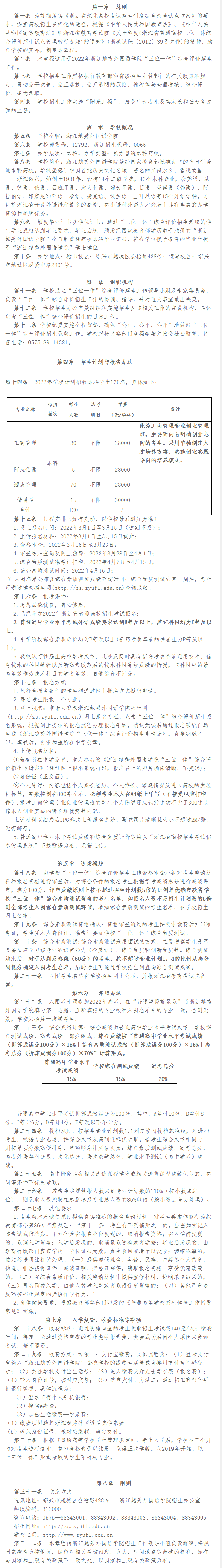 2022年 : 浙江越秀外国语学院2022年“三位一体”综合评价招生章程