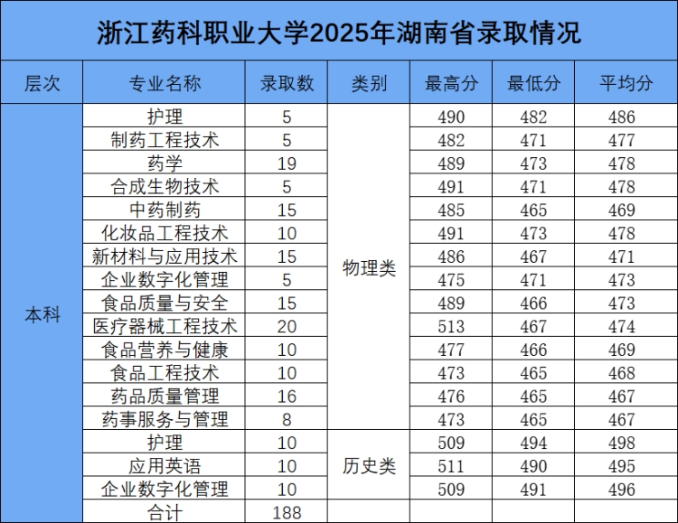 按照湖南省2025年招生录取进程,浙江药科职业大学湖南省本科批录取工作,本科招生录取数为188人(因体检不合格退档1人、不服从调剂退档1人)。