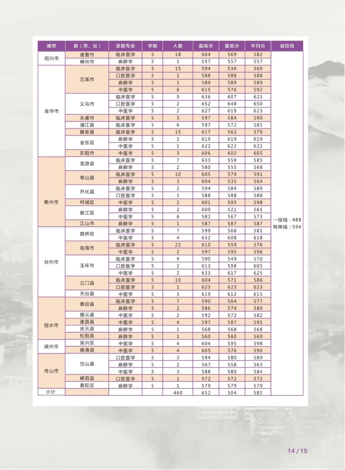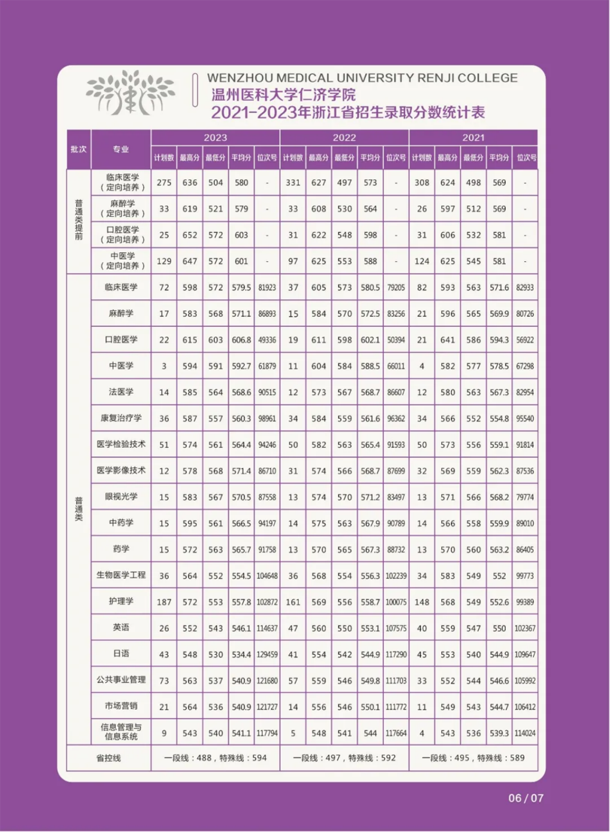 温州医科大学仁济学院 2021-2023年浙江省招生录取分数统计表 / 2023年基层卫生人才定向培养各县(市、区)录取分数统计 / 2021年-2023年外省录取分数统计