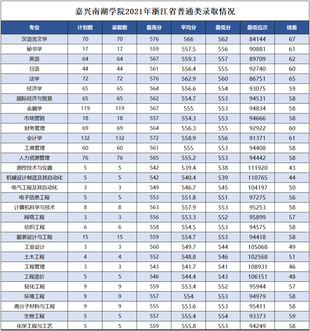 2022年 : 嘉兴南湖学院2021年浙江省内普通类一段录取情况