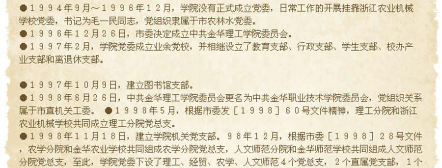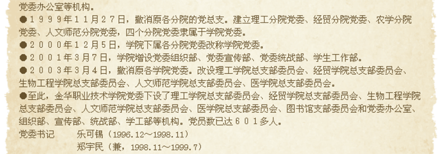 1998年12月,根据市委〔1998〕28号文件,农学分院和金华农业学校共同组成农学分院党总支,人文师范分院和金华师范学校共同组成人文师范分院党总支,至此,学校党委下设了理工、经贸、农学、人文师范4个党总支,2个直属党支部,1个党委办公室等机构。
