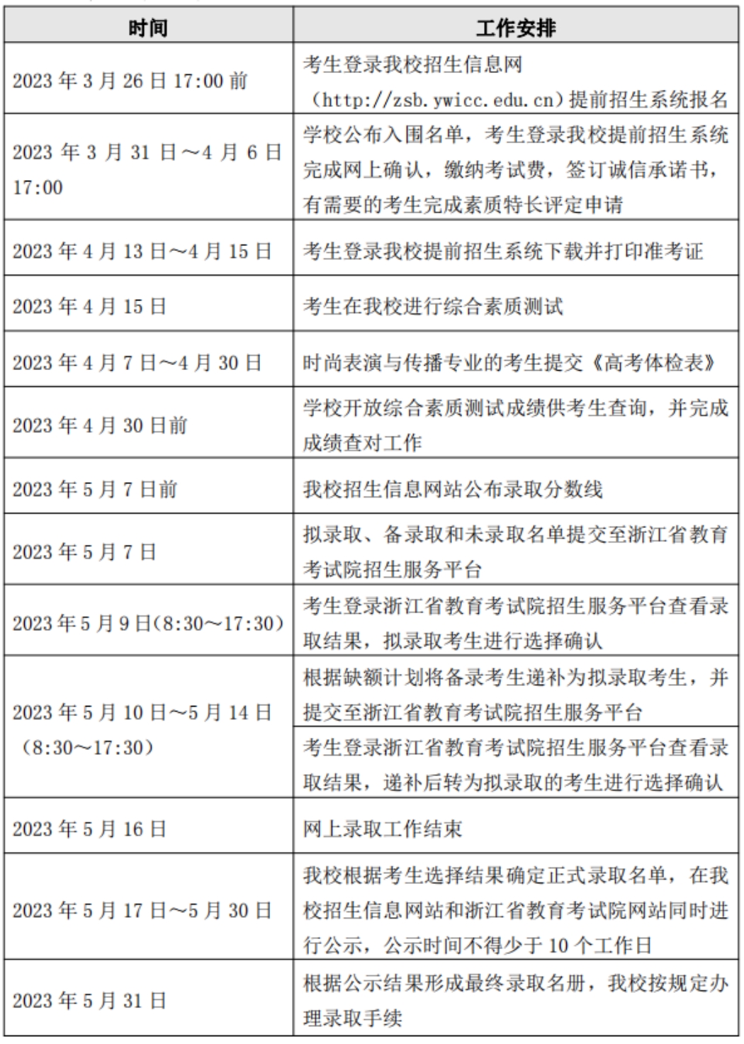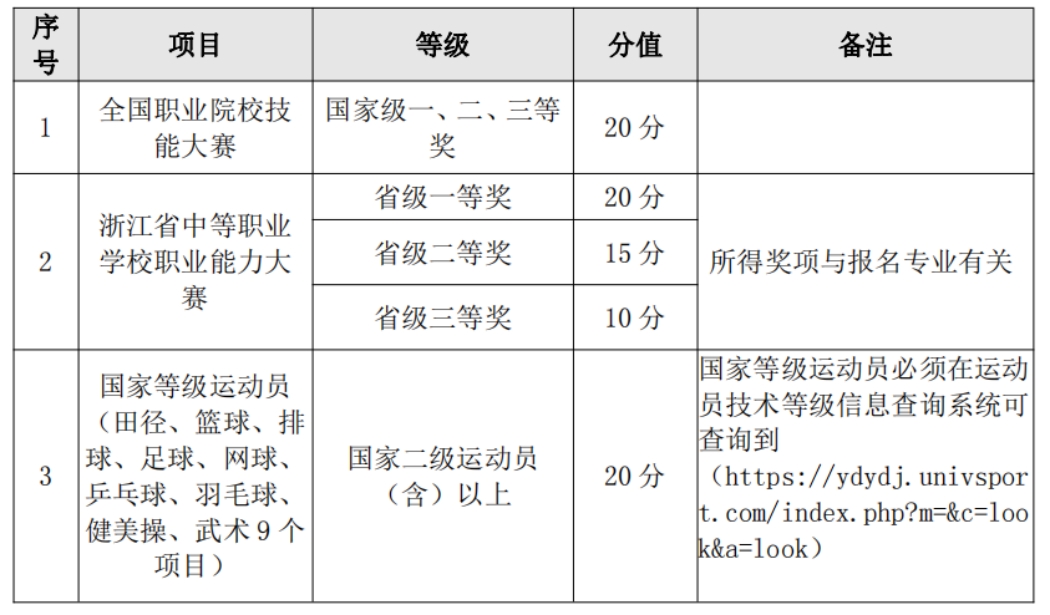 注:(1)考生填写《义乌工商职业技术学院2023年素质特长评定申请表》(可在我校招生信息网站下载),凭个人高中阶段所获得的相关比赛获奖证书,于4月1日-6日17:00通过我校提前招生管理系统申请。(2)奖状获得时间需在高中阶段且在我校报名截止日期之前;素质特长评定最高不超过20分。