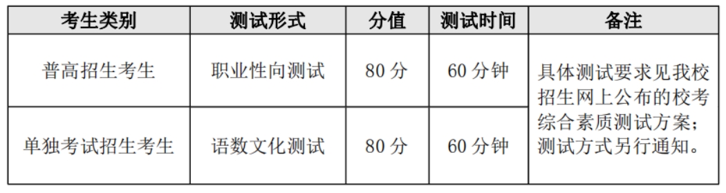 校考综合素质测试实行分类命题、分类评价。各专业普高招生考生进行职业性向测试,重点考核职业适应性;单独考试招生考生进行语数文化测试,重点考核文化素质。测试成绩四舍五入保留两位小数。具体测试规则如下: