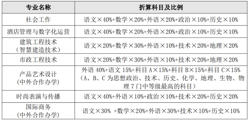 普高招生考生是将考生的高中学考成绩等级折算为相应的分值,再按各招生专业的学考科目折算规则进行折算,满分100分,四舍五入后保留两位小数。普高招生考生学考科目成绩具体折算表如下: