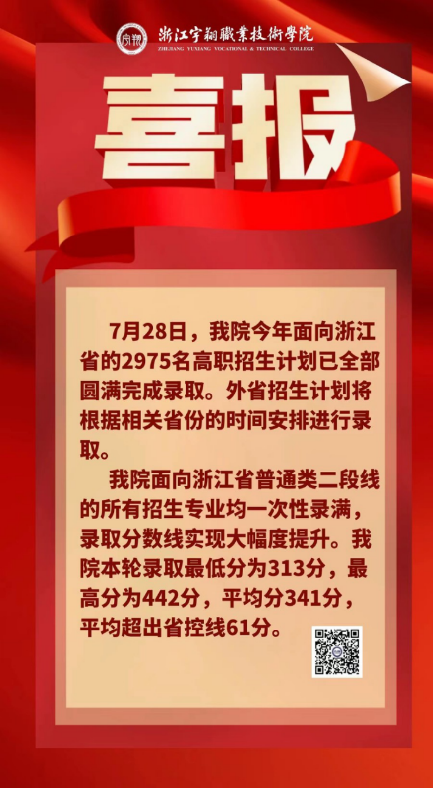 浙江宇翔职业技术学院面向浙江省普通类二段线的所有招生专业均一次性录满,录取分数线实现大幅度提升。
