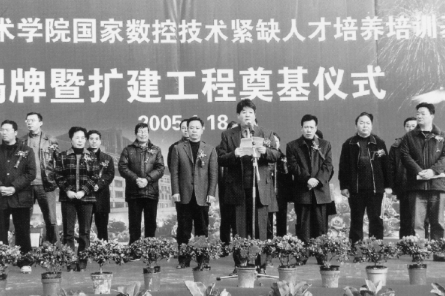 学校数控技术与应用专业被确定为“数控技术应用专业领域技能型国家紧缺人才培养培训基地”,市委副书记朱贤良(前排右五)出席奠基仪式。
