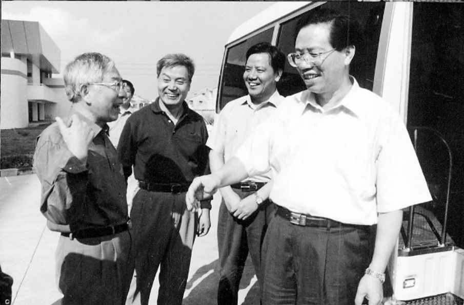 2000年10月10日,原省委副书记李金明(右一)在原市委书记孙忠焕(右二)陪同下视察我校,向我校原校长洪起超教授(左一)、原副校长张达明教授(左二)了解台州高等职业技术教育的发展情况。