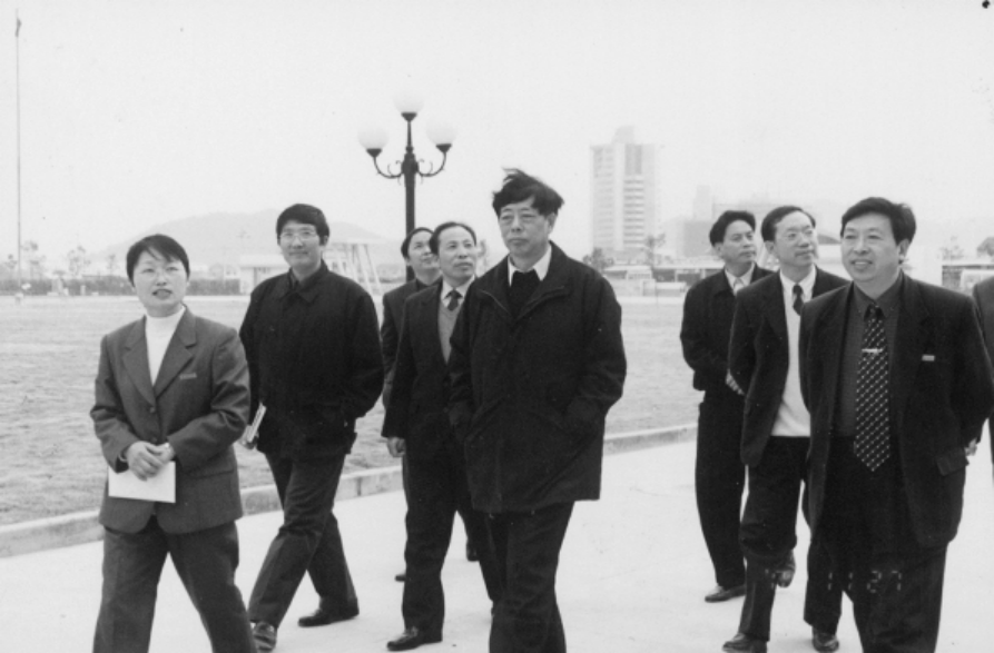 2000年11月27日,在原台州市教委主任朱李益(左三)陪同下省教育工委书记、教育厅长侯靖方(中)来我校调研考察。