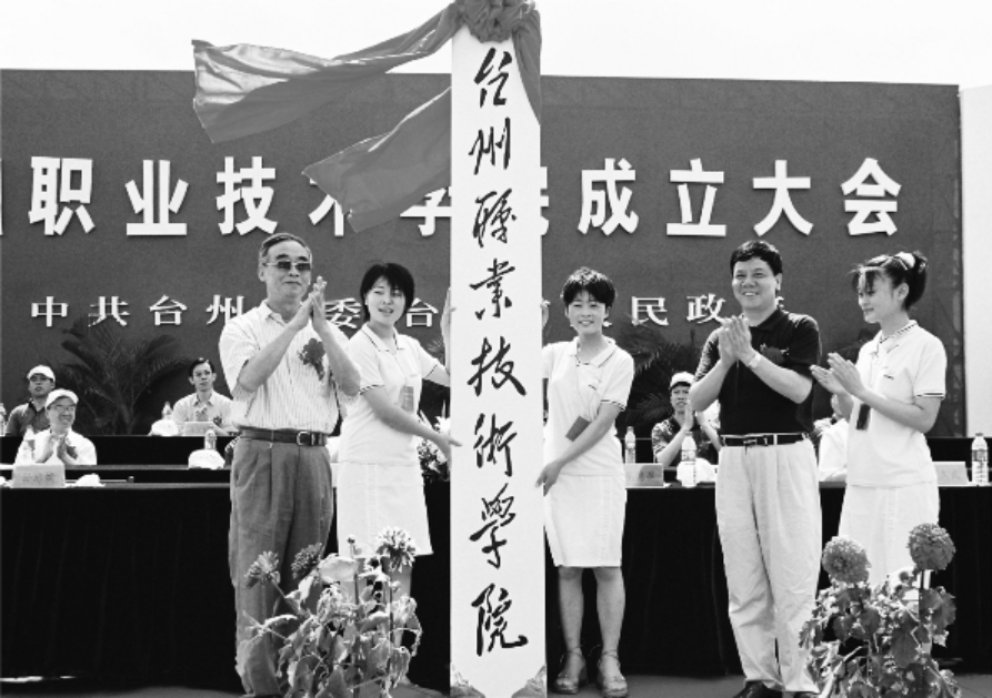 001年6月18日,台州市委、市政府隆重举行台州职业学院正式成立庆典仪式。原浙江省人大副主任李德葆(前排左一),原台州市委书记孙忠焕(前排右二)为台州职业技术学院正式成立揭牌。