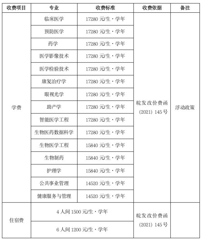七、学费标准:按照安徽省发展和改革委员会及安徽省教育厅备案的标准执行,具体如下: