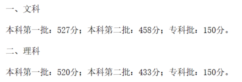 五、艺术类专业的录取由文化分数线和艺术统考分数线双线控制。各批次的录取最低控制分数线分别为: