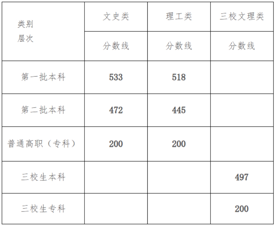 安徽省2023年普通高校招生文史、理工类录取控制分数线一览表