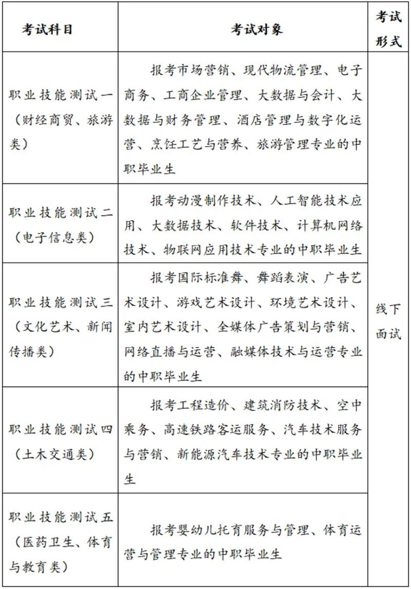 应往届普通高中毕业考生参加职业适应性测试,职业适应性测试主要考核考生未来从事生产、建设、服务、管理等一线工作所必备的基本职业素质,包括基本思想道德素养、基本文化素养、自我学习能力、信息处理能力、数字应用能力、沟通表达能力、团队合作能力、服从管理意识等方面,总分300分,测试时间15分钟;测试形式:到校测试;测试方式:面试。