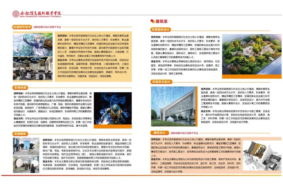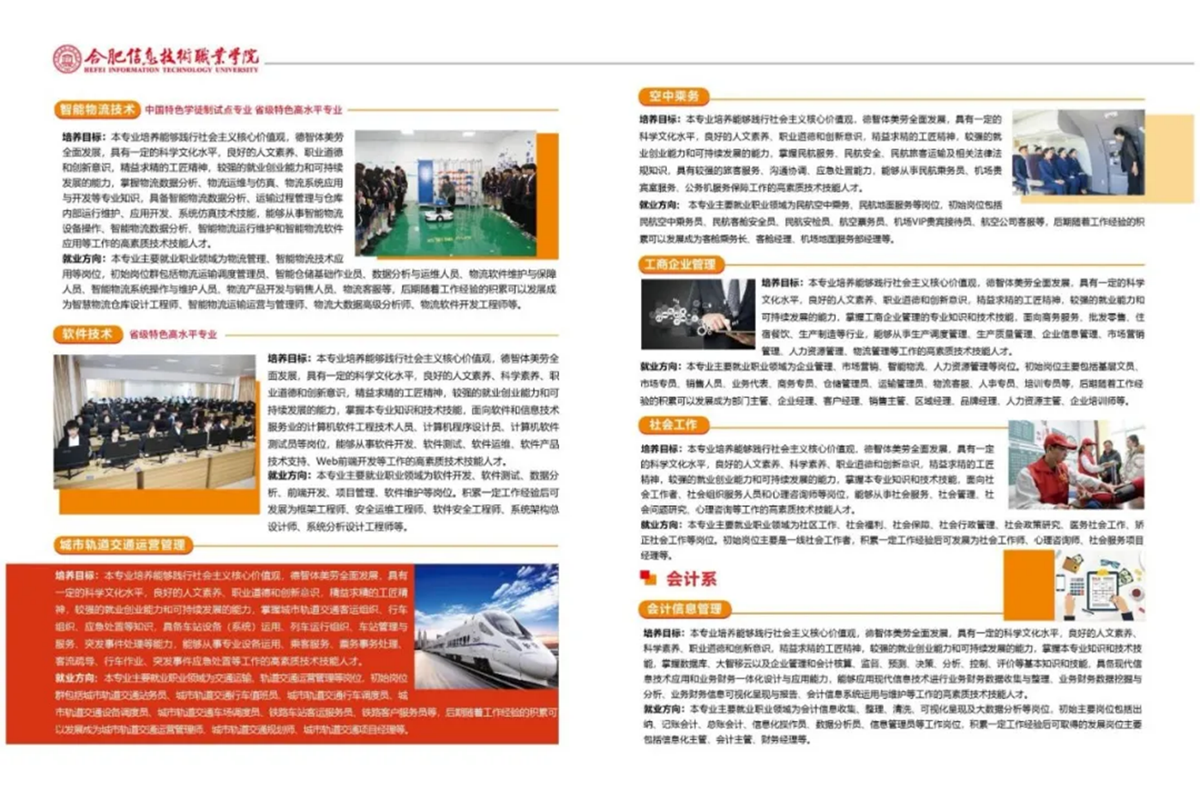 围绕安徽十大新兴产业高质量发展和“三地一区”建设,立足办学定位,结合优势资源,打造特色优势专业,优化专业结构。现有信息工程学院、未来学院、会计系、建筑系、土木工程系、新媒体艺术系、通识教育部和思政教学部等8个教学部门;开设人工智能技术应用、空中乘务、市政工程技术、城市轨道交通运营管理、电子竞技运动与管理、风景园林设计、财富管理、电子商务、市场营销、智能物流技术、软件技术、电子信息工程技术、大数据技术、计算机应用技术、物联网应用技术、信息安全技术应用、数字媒体技术、广告艺术设计、数字媒体艺术设计、动漫制作技术、工程造价、建设工程管理、建筑设计、环境艺术设计、会计信息管理、大数据与会计、连锁经营与管理、云计算技术应用、影视动画、影视编导、健康大数据管理与服务、婴幼儿托育服务与管理、机电一体化技术、工商企业管理、社会工作、学前教育36个全日制三年制高职招生专业、11个五年制高职招生专业,覆盖电子信息、计算机、金融、财务会计、航空运输、城市轨道交通、工商管理、电子商务、物流、建筑设计、建设工程管理、艺术设计、广播影视、公共卫生与卫生管理、健康管理与促进、市政工程、自动化、教育、公共事业、体育20个专业类,形成电子信息、电子商务、艺术设计、建筑设计、财务会计5个专业群,每个专业群都以特色专业或重点建设专业为核心,引领、示范、带动整个专业群发展,形成以信息技术相关专业为特色,其它专业协调发展的专业格局。其中,信息安全技术应用专业群为省级高水平专业群;信息安全技术应用专业被教育部认定为骨干专业,电子商务、信息安全技术应用2个专业为省级特色专业,计算机应用技术、智能物流技术、软件技术、大数据与会计4个专业为省级特色高水平专业,电子商务、计算机应用技术、智能物流技术3个专业为中国特色现代学徒制专业,建筑设计、动漫制作技术2个专业为创新发展行动计划省级骨干专业,大数据技术、电子信息工程技术、物联网应用技术3个专业为省级卓越人才教育培养计划实施专业。