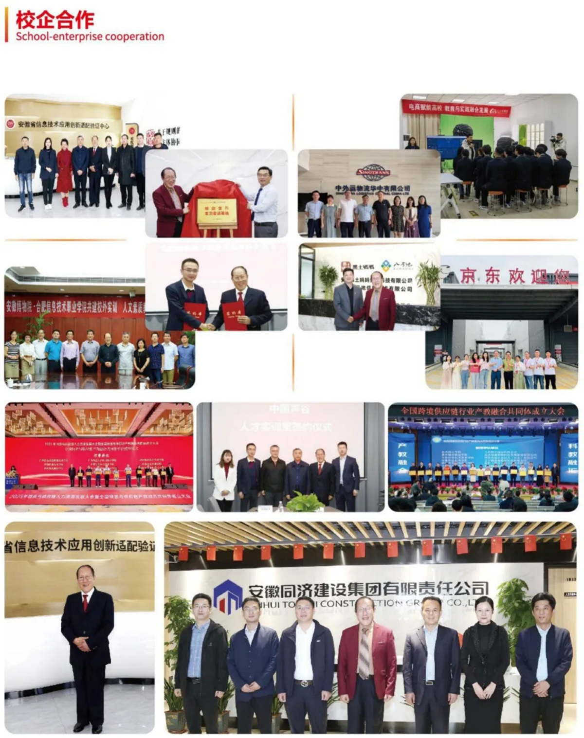 建有中央财政支持的职业教育实训基地1个,工业和信息化部、安徽省人民政府共同推进安微智能语音产业发展领导小组办公室立项建设的实训室2个(人工智能人才实训室、软件开发人才实训室),安微省职教智慧终端信息消费示范体验中心1个,以及网络安全、智悬物流、数字媒体、工艺美术、智能财会、BIM、电子竞技、建筑制图等实验实训室52个;与科大讯飞股份有限公司、华云数据有限公司、深信服科技股份有限公司、北京络捷斯特科技发展股份有限公司、合肥京东方视讯科技有限公司、京邦达供应链科技有限公司(京东物流)、中外运物流华中有限公司、合肥比亚迪汽车有限公司等130余家企事业单位建立了长期稳定的合作关系;与湖南锐领视界互娱科技有限公司合作开设“锐领视界班”订单班,校企共同开展电子商务、数字煤体技术等专业人才培养。
