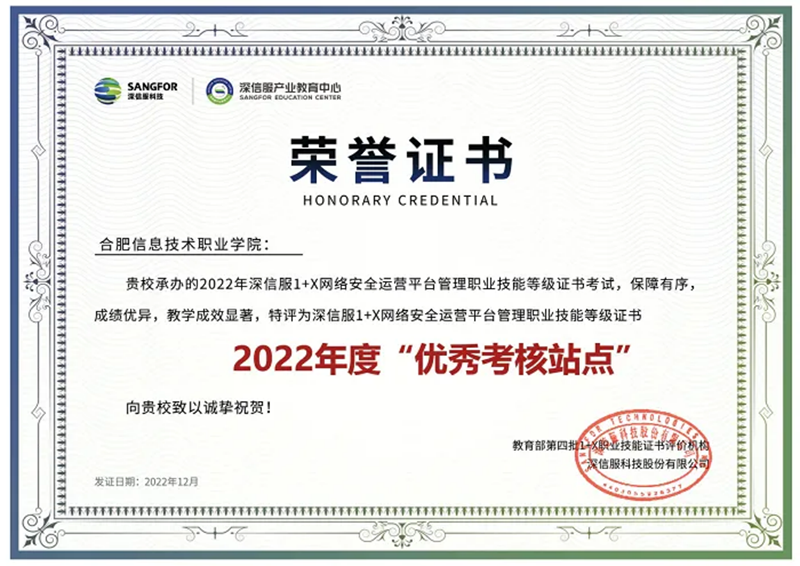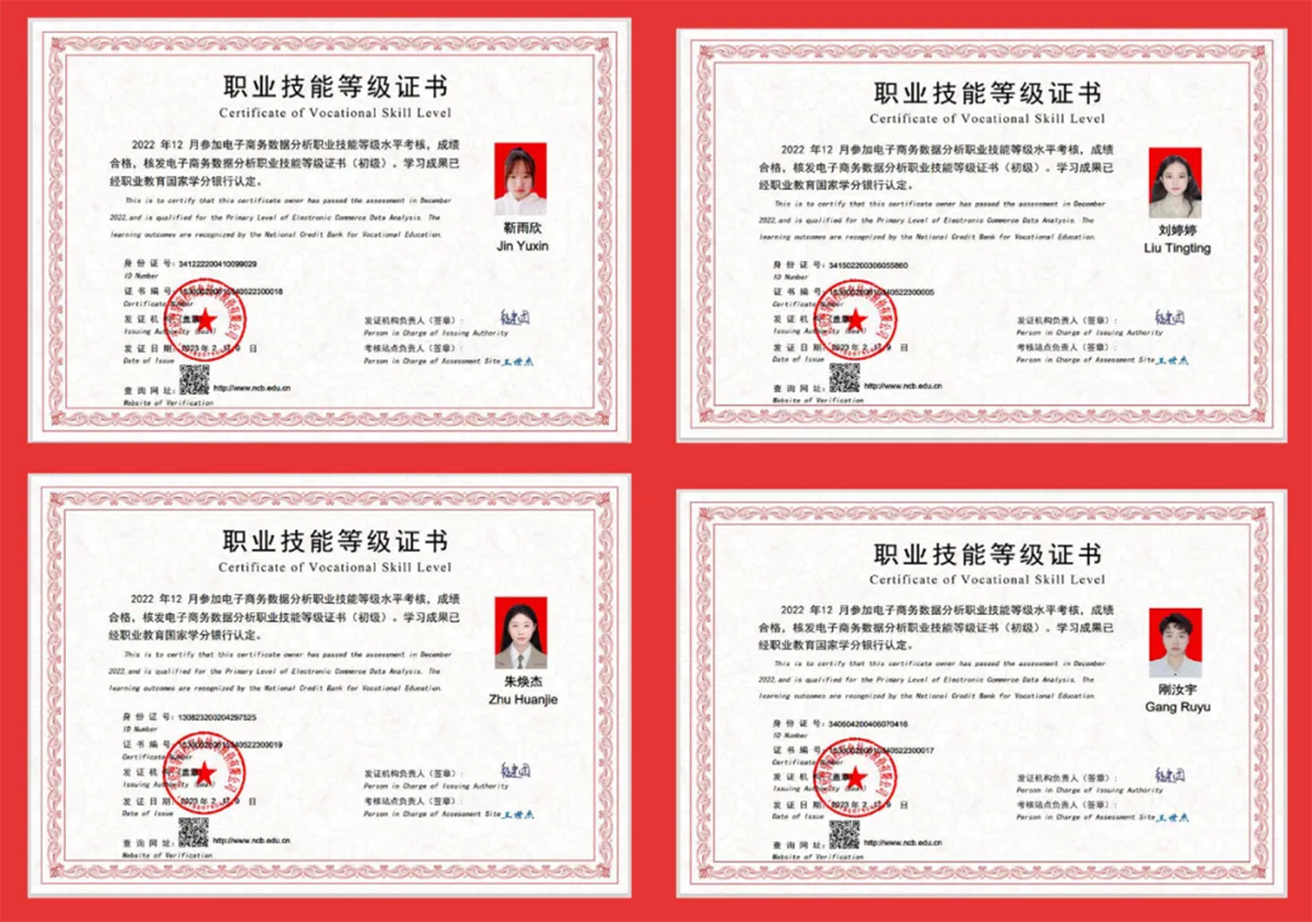 学校是教育部“1+X”证书制度试点院校,个税计算、Python程序开发、数字创意建模、物流管理、网络系统规划与部署、网络安全运营平台管理、电子商务数据分析等“1+X”职业技能等级证书考核站点,全国大学英语四六级考试(CET)、全国高等学校英语应用能力考试、全国计算机等级考试(NCRE)、全国计算机应用水平考试(NIT)、全国高等学校计算机水平考试、Adobe认证、Autodesk认证等考试考点,可鉴定321种工种(科目)。2021届毕业生获证率93.76%,2022届毕业生获证率93.83%,2023届毕业生获证率94.59%。被评为“1+X”网络安全运营平台管理职业技能等级证书2022年度“优秀考核站点”、“1+X”电子商务数据分析职业技能等级证书2022年度“优秀考核院校”。