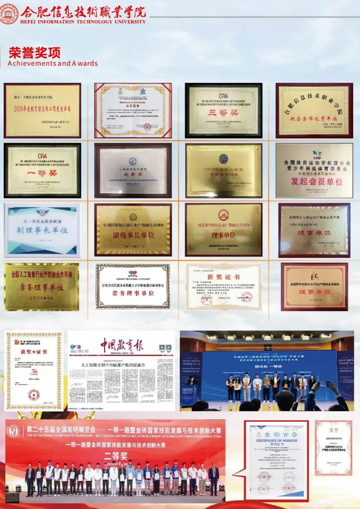 获批中央财政支持的职业教育实训基地建设项目1项、工业和信息化部和安徽省人民政府指导建设的实训基地2个、教育部“供需对接就业育人项目”4项、中国高等教育学会科学研究规划课题1项、省级质量工程项目109项、省高等教育振兴计划项目4项、高职教育创新发展行动计划项目8项、高校优秀拔尖人才培育资助优秀青年人才支持计划项目5项、高等学校青年骨干教师国内访问学者项目3项、高校科学研究项目32项、省职成学会教育教学研究规划课题9项、省级基层示范教研室项目1项、省级教学示范课项目6门、职业教育提质培优行动计划项目9项。学院连续两年被省教育厅评为“民生工程高校学生资助工作考核优秀单位”,被省民政厅评为“中国社会组织评估AAAA等级”,连续两年荣获省属“百优社会组织”称号,荣获安徽省平安校园建设优秀成果二等奖,荣获全国高校创新创业教育示范学校成果孵化奖,荣获2020中国职业院校智慧校园50强,荣获2020年大数据科技传播奖团体“创新奖”,被评为安徽省2020年度教育信息化工作先进单位;学院党校连续两年荣获合肥市“先进基层党校”称号。2015年11月,顺利通过人才培养工作评估。2017年,在基层党组织标准化建设考核验收中,院党委被上级党组织评定为“先进”等次。2019年,院党委被上级党委评为“先进党组织”。团委获2022年度“合肥市共青团工作先进单位”称号。学院是安徽省“双高计划”专业群建设单位、电子竞技专业委员会(全国高等院校计算机基础教育研究会)理事单位、全国体育运动学校联合会青少年科技体育委员会发起会员单位、长三角电竞教育联盟副理事长单位、一带一路暨金砖国家技能发展国际联盟会员单位、全国跨境供应链行业产教融合共同体副理事长单位、全国人工智能行业产教融合共同体常务理事单位、全国大数据行业产教融合共同体常务理事单位、全国网络安全行业产教融合共同体理事单位、软件和信息服务(数字技术)行业产教融合共同体理事单位、全国物流与供应链产教融合共同体理事单位、国家数智财经行业产教融合共同体理事单位、全国会计行业产教融合共同体理事单位、全国数字创意AIGC行业产教融合共同体理事单位、全国数字财金行业产教融合共同体理事单位、安徽铁道职业教育集团理事单位、安徽网络安全产教融合联盟理事单位、安徽省现代服务业技能人才评价联盟首届理事会常务理事单位、安徽省力学学会理事单位、南京工业设计学会第十届理事会特邀理事单位、安徽省高校档案工作协会第五届理事单位。产教融合、人才培养、思政教育等成效,广受《中国教育报》《光明日报》《国家教育行政学院学报》、安徽教育网等关注与报道。