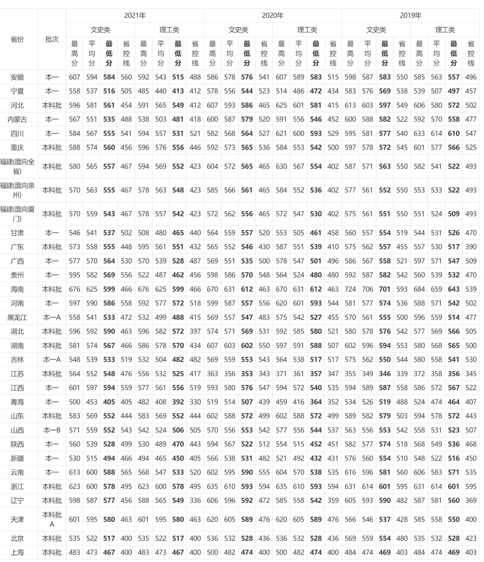 2021年 : 华侨大学2019-2021年在各省份录取分数情况