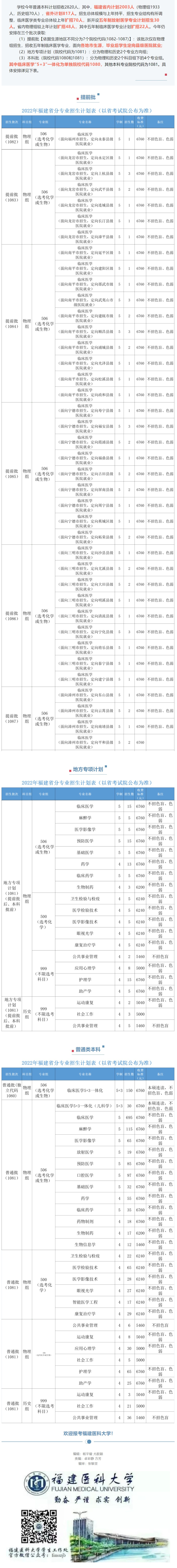 2022年 : 福建医科大学2022年普通本科省内招生计划表