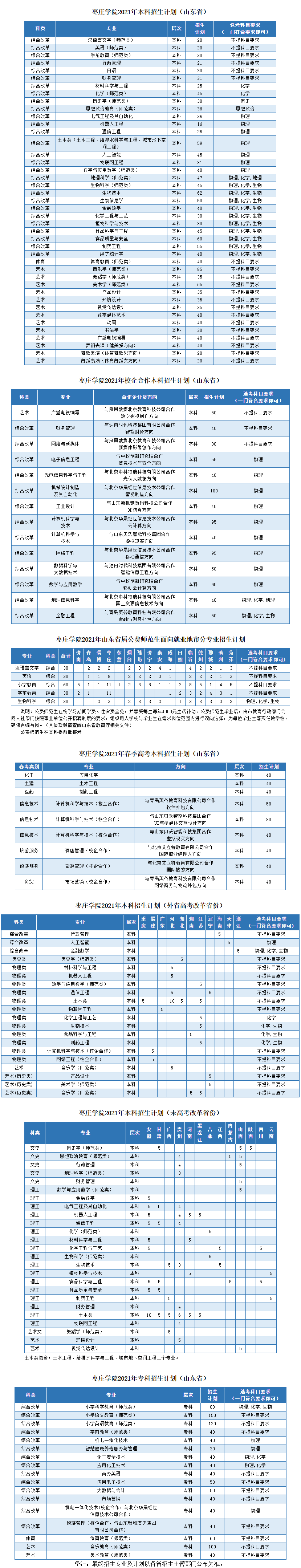 枣庄学院2021年本科招生计划(山东省)/ 枣庄学院2021年校企合作本科招生计划(山东省)/ 枣庄学院2021年山东省属公费师范生面向就业地市分专业招生计划 / 枣庄学院2021年春季高考本科招生计划(山东省)/ 枣庄学院2021年本科招生计划(外省高考改革省份)/ 枣庄学院2021年本科招生计划(未高考改革省份)/ 枣庄学院2021年专科招生计划(山东省)