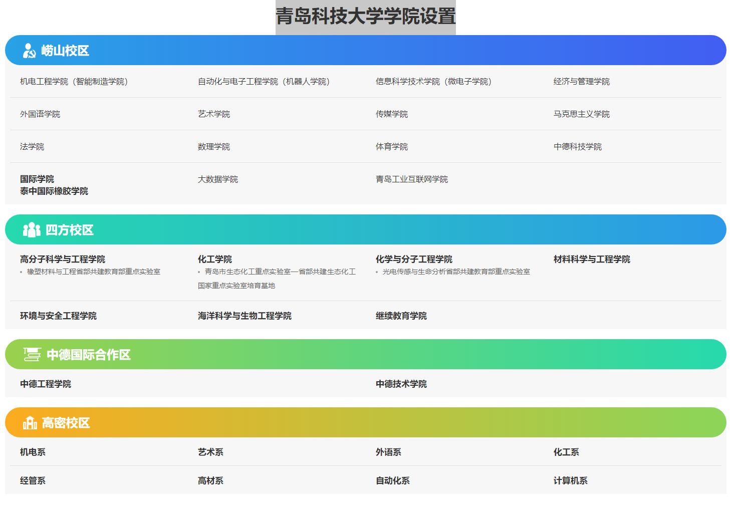 青岛科技大学是一所以工为主,理、工、文、经、管、医、法、艺、教等学科协调发展、特色鲜明的多科性大学。学校是国家“111计划”立项建设单位、山东省属重点建设的大学、山东省“强特色”高水平大学、山东省应用基础型人才培养特色名校,被教育部评估为“本科教学工作水平评估优秀高校”“全国毕业生就业典型经验高校”和“全国创新创业典型经验高校”,荣获“山东省第一届省级文明校园”荣誉称号,被社会赞誉为“中国橡胶工业的黄埔”。