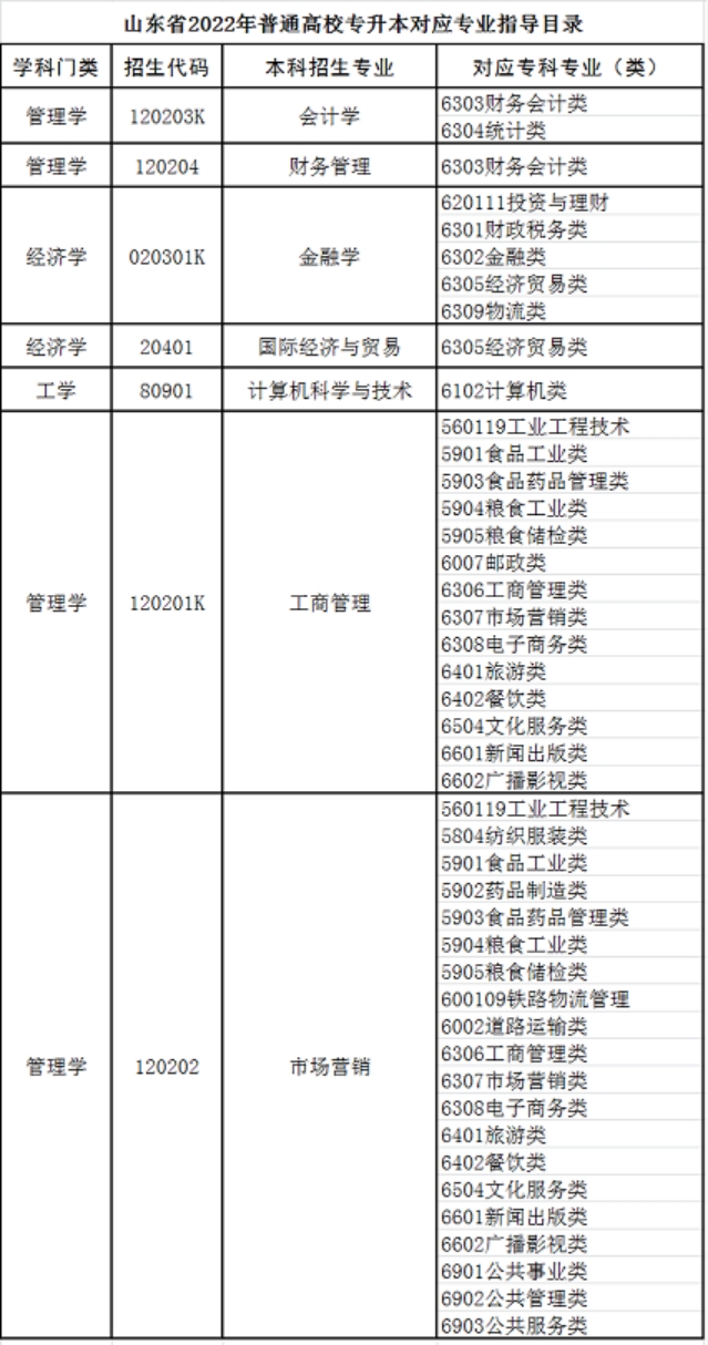 符合山东省2022年专升本报考条件的自荐考生,且专科段所学专业(类)符合《关于做好2022年普通高等教育专科升本科考试招生工作的通知》要求(见鲁教学字〔2021〕9号)。我校普通专升本招生专业及所对应专科专业(类)见下表: