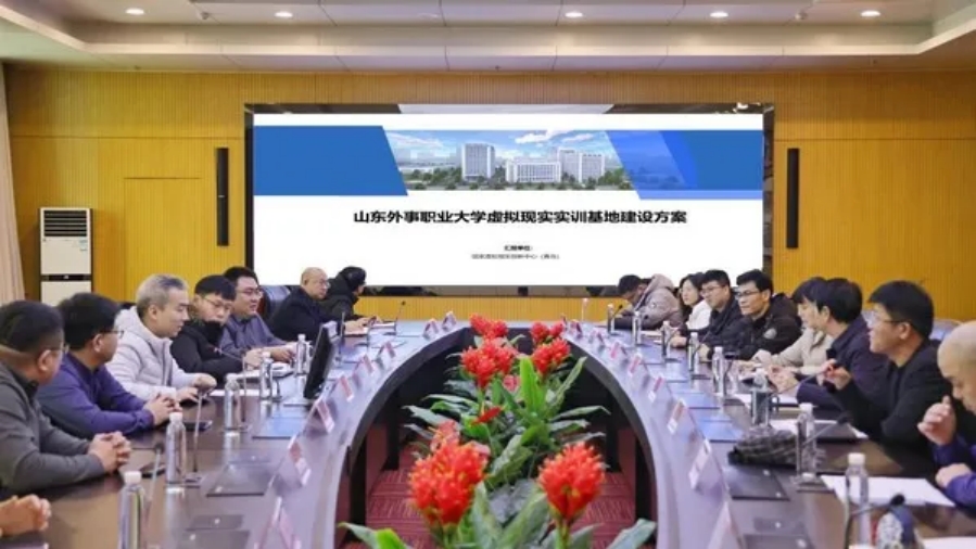 ▲山东外事职业大学召开虚拟现实实训基地建设交流研讨会