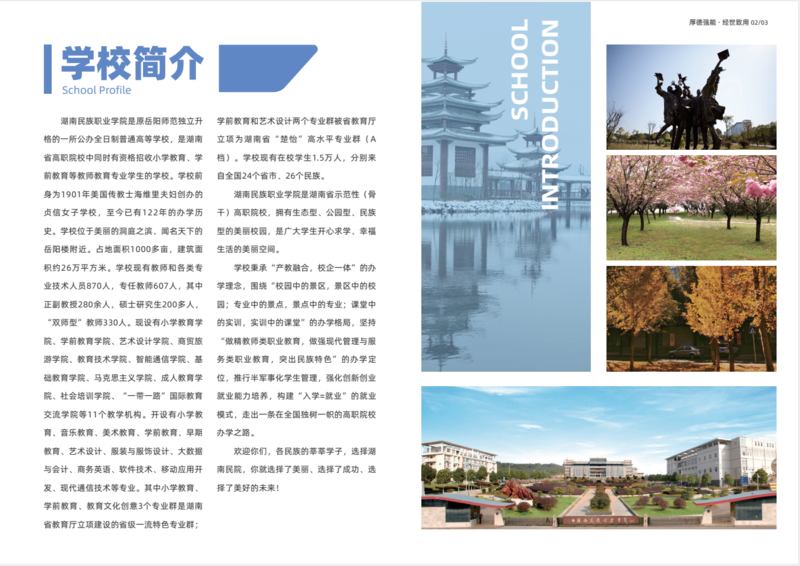 湖南民族职业学院是原岳阳师范独立升格的一所公办全日制普通高等学校,是湖南省高职院校中同时有资格招收小学教育、学前教育等教师教育专业学生的学校。学校前身为1901年美国传教士海维里夫妇创办的贞信女子学校,至今已有122年的办学历史。