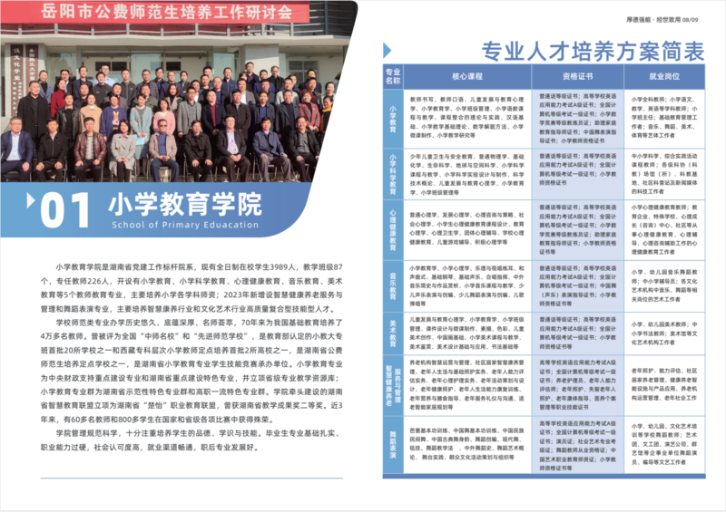 学校位于美丽的洞庭之滨、闻名天下的岳阳楼附近。占地面积1000多亩,建筑面积约26万平方米。学校现有教师和各类专业技术人员870人,专任教师607人,其中正副教授280余人,硕士研究生200多人,“双师型”教师330人。现设有学前教育学院、小学教育学院、艺术设计学院、商贸旅游学院、教育技术学院、智能通信学院、基础教育学院、马克思主义学院、成人教育学院、社会培训学院、“一带一路”国际教育交流学院等11个教学机构。开设有小学教育、音乐教育、美术教育、学前教育、早期教育、艺术设计、服装与服饰设计、大数据与会计、商务英语、软件技术、移动应用开发、现代通信技术等专业。其中小学教育、学前教育、教育文化创意3个专业群是湖南省教育厅立项建设的省级一流特色专业群;学前教育和艺术设计两个专业群被省教育厅立项为湖南省“楚怡”高水平专业群(A档)。学校现有在校学生1.5万人,分别来自全国24个省市、26个民族。