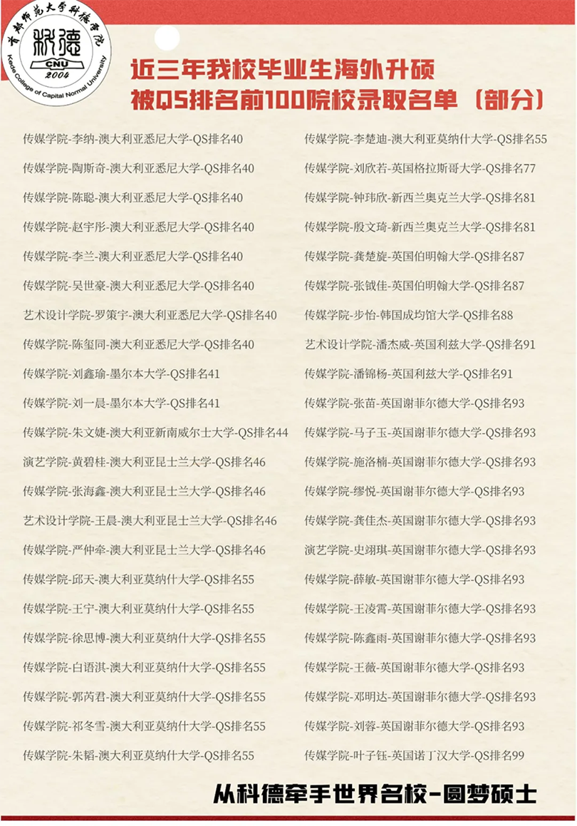 ●近十年毕业生就业率达96%以上;学校与中央新影集团、国家大剧院、国展中心、798艺术中心、国家新媒体产业基地等100多家校外企业建立了合作关系,联手打造一批一流的、符合学生发展需要的实习实践基地,增强学生的应用能力,提高就业竞争力。中央新影集团作为首都师范大学科德学院的实践基地,2015年获批“北京市高等学校市级校外人才培养基地”省部级实践教学基地。