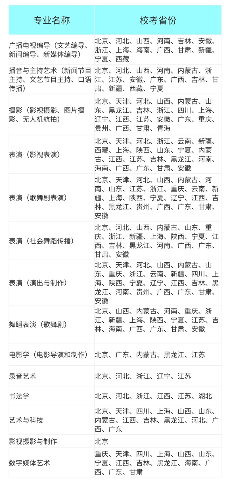 1、广播电视编导、播音与主持艺术在浙江、河南、甘肃、安徽为省统考涉及专业,考生需在省统考合格基础上,参加我校校考;其他省份为省统考不涉及专业,考生可直接参加我校校考。2、摄影在浙江、安徽为省统考涉及专业,考生需在省统考合格基础上,参加我校校考;其他省份为省统考不涉及专业,考生可直接参加我校校考。3、舞蹈表演(歌舞剧)、表演(影视表演、歌舞剧表演、社会舞蹈传播、演出与制作)在浙江、河南、安徽为省统考涉及专业,考生需在省统考合格基础上,参加我校校考;其他省份为省统考不涉及专业,考生可直接参加我校校考。4、电影学(电影导演与制作)、数字媒体艺术、录音艺术、书法学、艺术与科技、影视摄影与制作为省统考不涉及专业,考生可直接参加我校校考。