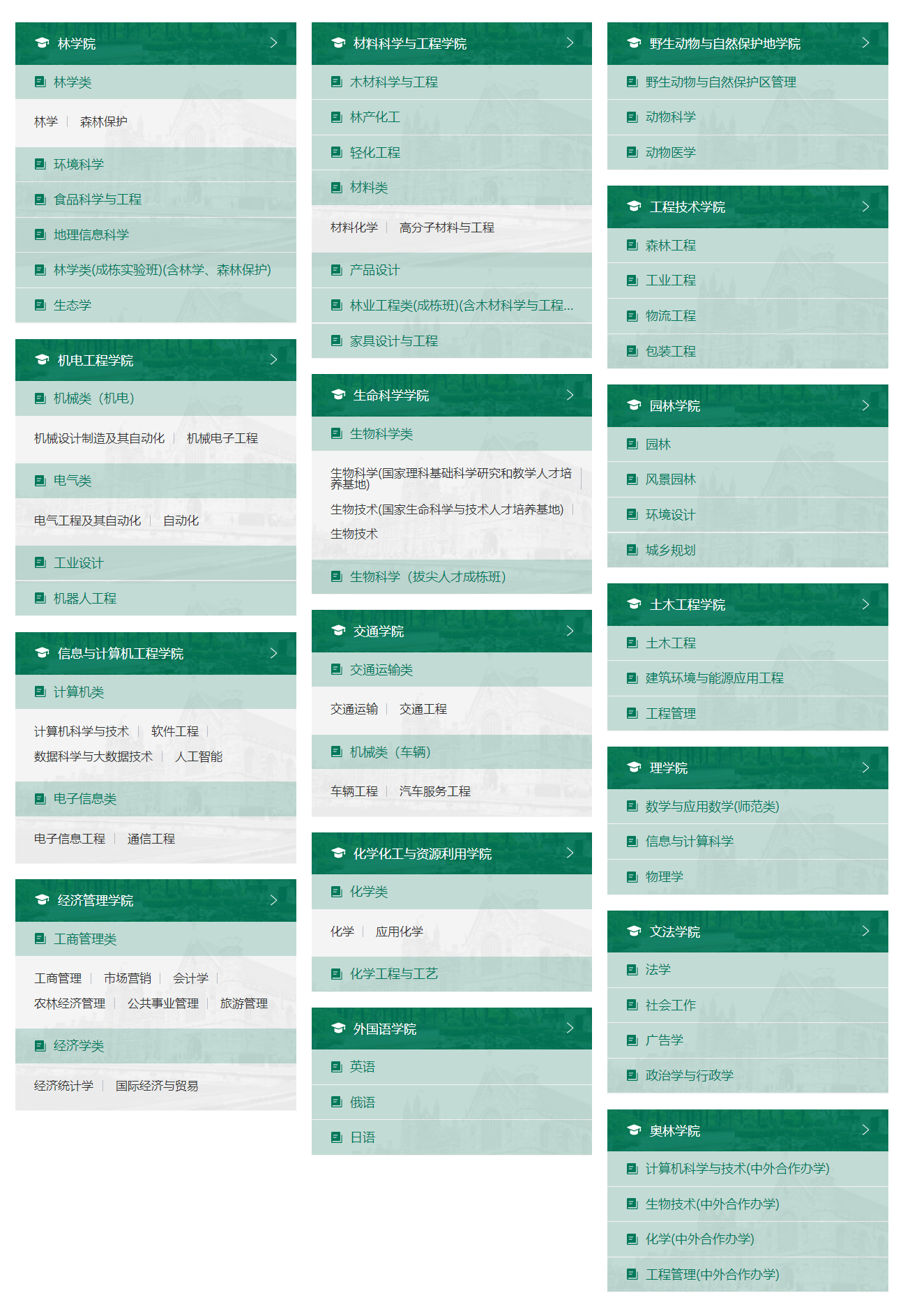 学科专业。学校现设有研究生院、19个学院和1个教学部,有68个本科专业、19个国家级一流本科专业建设点,10个一级学科博士点,19个一级学科硕士点,17个类别的专业学位硕士点,9个博士后科研流动站,1个博士后科研工作站。拥有林业工程、林学2个世界一流建设学科,生物学、生态学、风景园林、农林经济管理4个国内一流建设学科,3个一级学科国家重点学科、11个二级学科国家重点学科、6个国家林草局重点学科、2个国家林草局重点(培育)学科、1个黑龙江省重点学科群、7个黑龙江省重点一级学科。学校现有植物学与动物学、农业科学、化学、材料科学、工程学、环境科学与生态学等6个学科进入ESI全球排名1%。有国家发改委和教育部联合批准的国家生命科学与技术人才培养基地、教育部批准的国家理科基础科学研究和教学人才培养基地(生物学),是国家教育体制改革试点学校,国家级卓越工程师和卓越农林人才教育培养计划项目试点学校,教育部深化创新创业教育示范高校,全国高校实践育人创新创业基地。