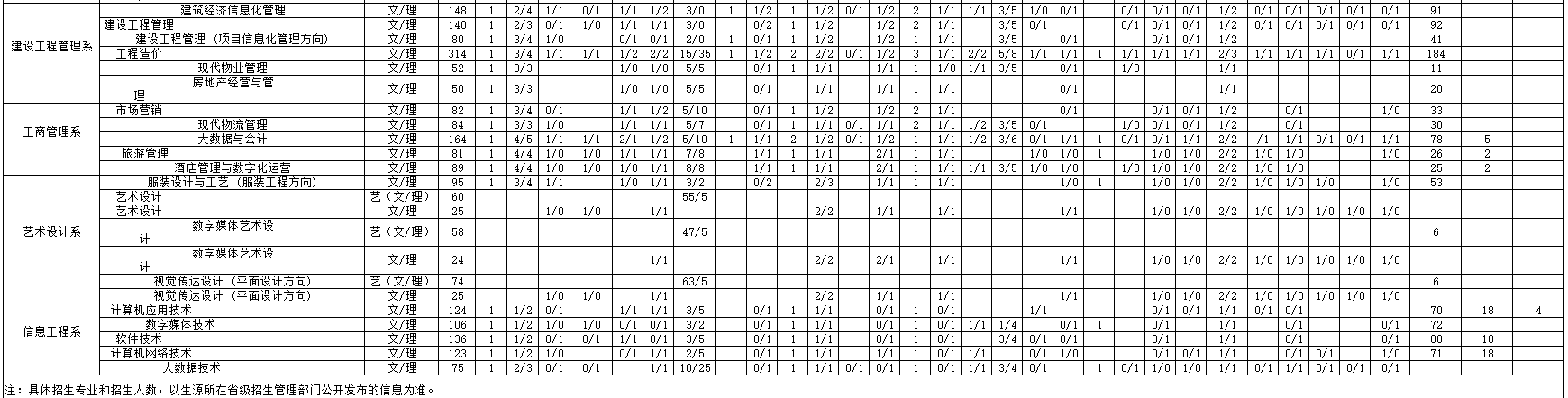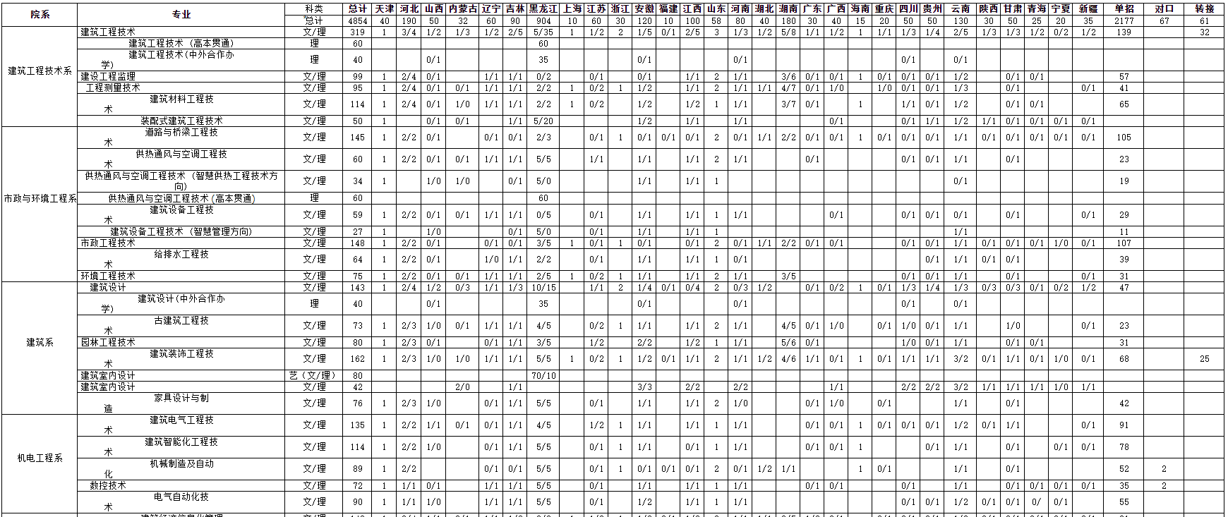 学院设有建筑工程技术系、市政与环境工程系、机电工程系、建筑系、建设工程管理系、工商管理系、艺术设计系、信息工程系、继续教育学院、公共教学部、军事体育部、思想政治部、现代教育技术与网络中心、图文信息中心、教学实训中心、创新创业中心。学院拥有建筑面积达8.73万平方米的集教学、科研、培训和服务于一体的校内实验实训基地9个,校外实习实训就业基地348个,形成了以土建为优势,以建筑工程技术、设备管理为特色,土建、制造、财经、材料、电子信息、艺术、旅游9大类44个专业协调动态发展的专业结构布局。