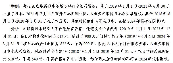若考生本人或其父母一方未取得住在国长期或永久居留权,但已取得住在国连续5年以上(含5年)合法居留资格注4、5年内注5在住在国累计居留不少于30个月注6,且考生本人在报名前5年内(即2019年4月1日—2024年3月31日)在住在国实际累计居留不少于30个月注6的,也可参加报名。